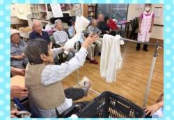 ハンガーラックめがけフェイスタオルを投げて点数を競うレクリエーションでした。